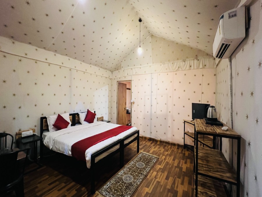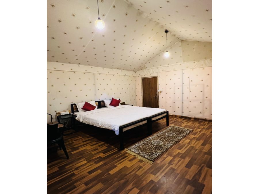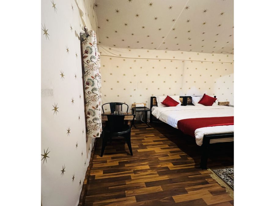 Terrific in every sense, the tents nestle midst the serene views of great natural beauty. The tents are in designed in a way that every kind of traveller falls in love with that encircles them, be it honeymooners, families with kids . Luxury swiss tent provides a spacious and comfortable setting, ideal for two individuals or couples. Featuring a large double bed, the room is designed with modern furnishings, including a wardrobe, study desk, and attached bathroom. It offers essential amenities such as Wi-Fi, air conditioning, and regular housekeeping, ensuring a relaxed and convenient stay. Perfect for students, professionals, or travelers, the room creates a warm and inviting environment, balancing comfort and privacy with ample space for shared living.